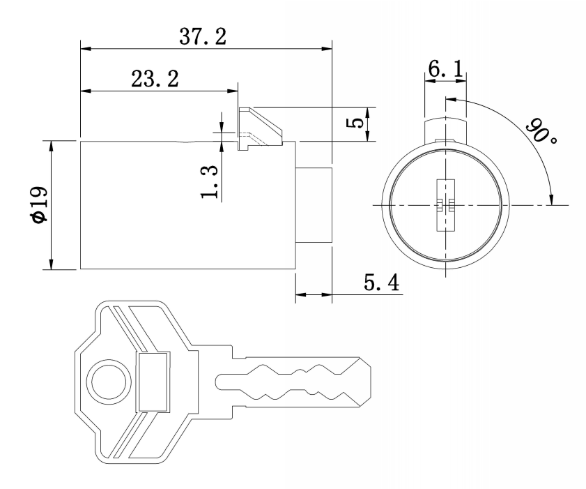 1.90°旋轉(zhuǎn)實(shí)現(xiàn)開啟或關(guān)閉,鑰匙在12點(diǎn)位置拔出。