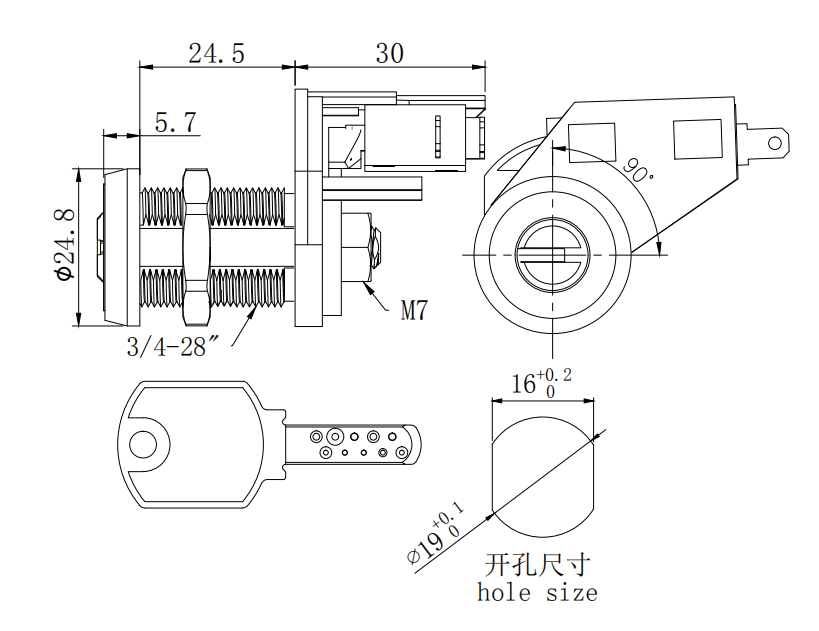 1.90°旋轉(zhuǎn)實(shí)現(xiàn)開啟或關(guān)閉。鑰匙在12點(diǎn)位置拔出。