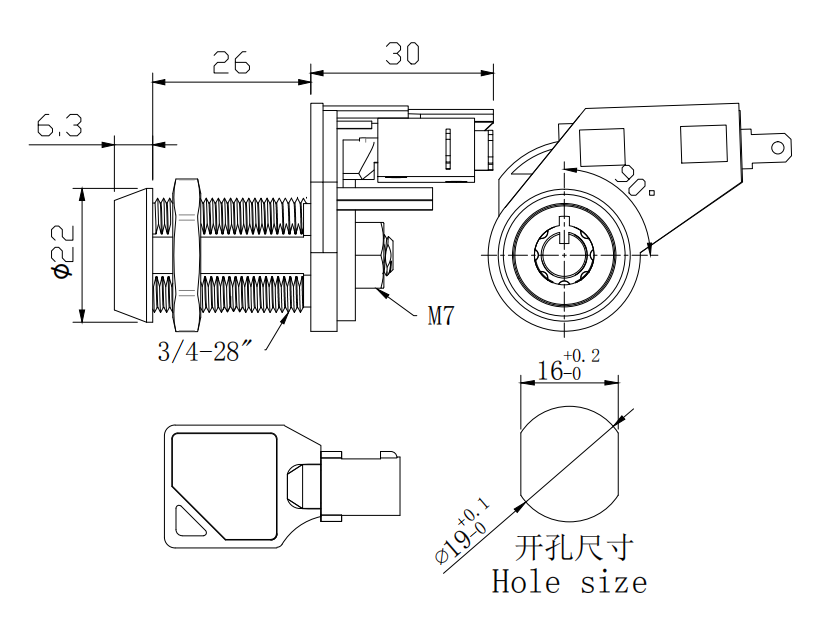 1.90°旋轉(zhuǎn)實現(xiàn)開啟或關(guān)閉,可選是否留匙。