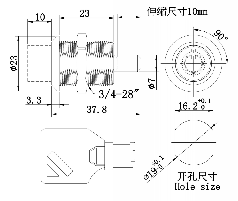 1.90°旋轉(zhuǎn)實(shí)現(xiàn)開(kāi)啟,鑰匙在12點(diǎn)位置拔出,按下鎖頭實(shí)現(xiàn)關(guān)閉。