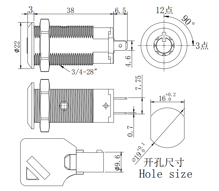 1.90°旋轉(zhuǎn)實現(xiàn)開啟或關(guān)閉,鑰匙在12點位置拔出。